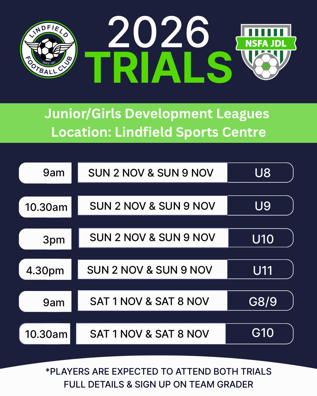 NOTE: For 2026 NSFA have capped Lindfield FC to only one JDL 1 team and one JDL 2 team. NSFA have also introduced a Girls Only JDL for G10 & G11s.