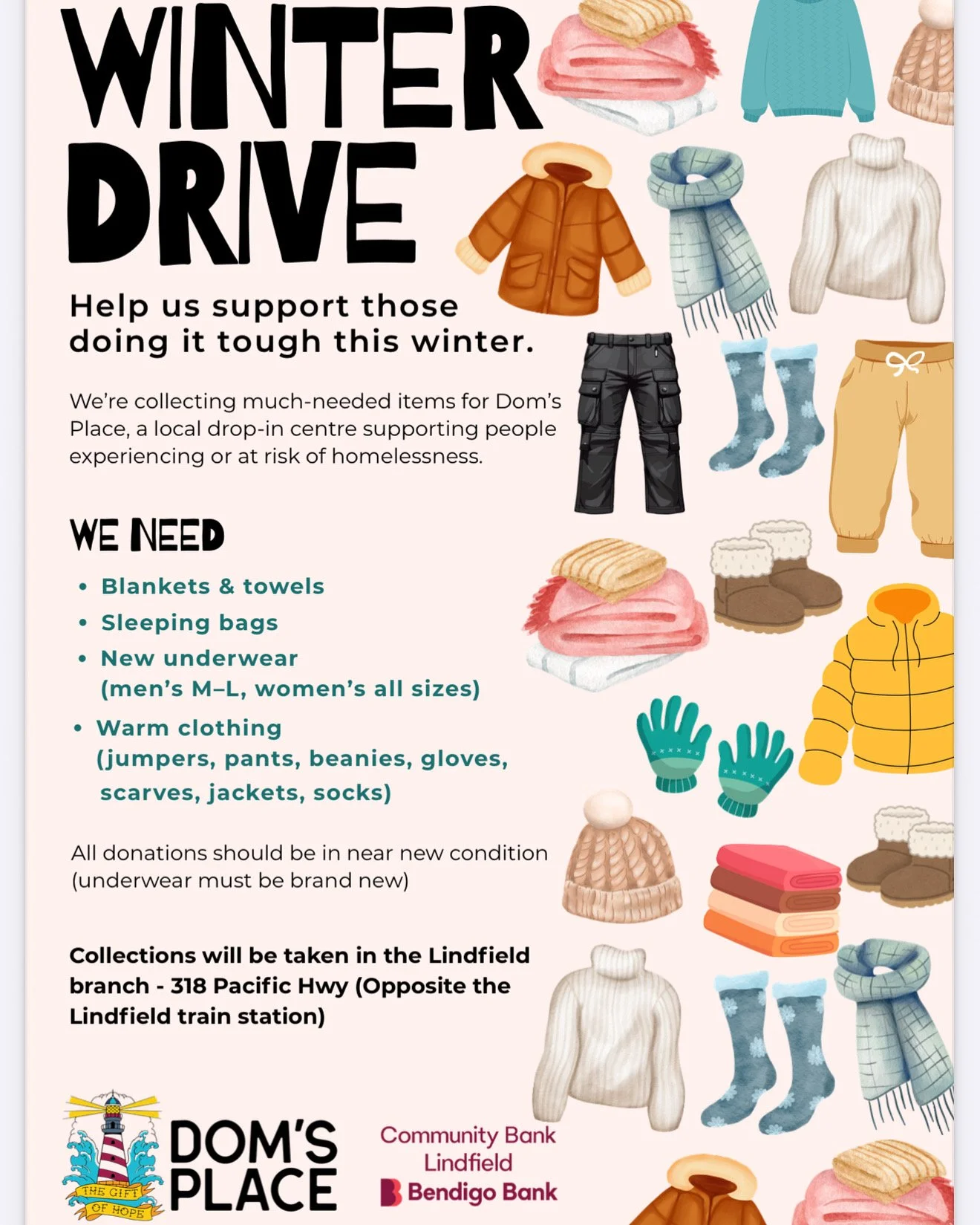Bendigo Bank is running a Winter collection from next week to support Dom’s Place. They’re collecting blankets, towels, and warm clothing.